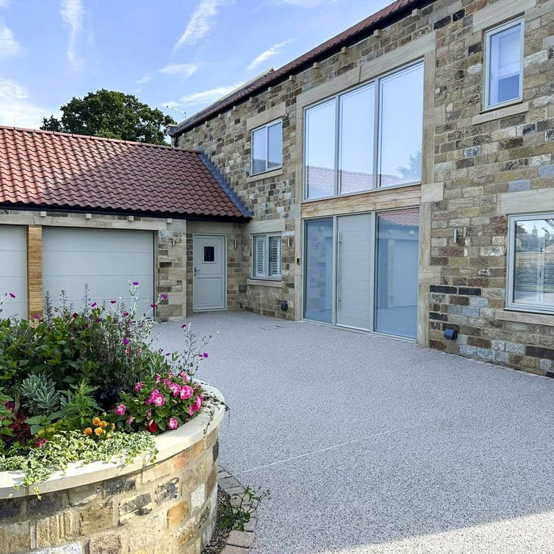 Ce mélange de graviers résineux est l'incarnation même de l'opulence. Ce luxueux mélange de granulats liés à la résine présente des tons argentés et crème, créant une surface nacrée et saisissante. C'est un best-seller grâce à sa transférabilité et son aspect luxueux. Pour un look contemporain, associez cette couleur de pierre résineuse à des lignes épurées, de l'argent et du blanc. Ce lot contient quatre sacs de 25 kg de granulats résineux et 7 kg de résine UVR Pro, parties A et B.