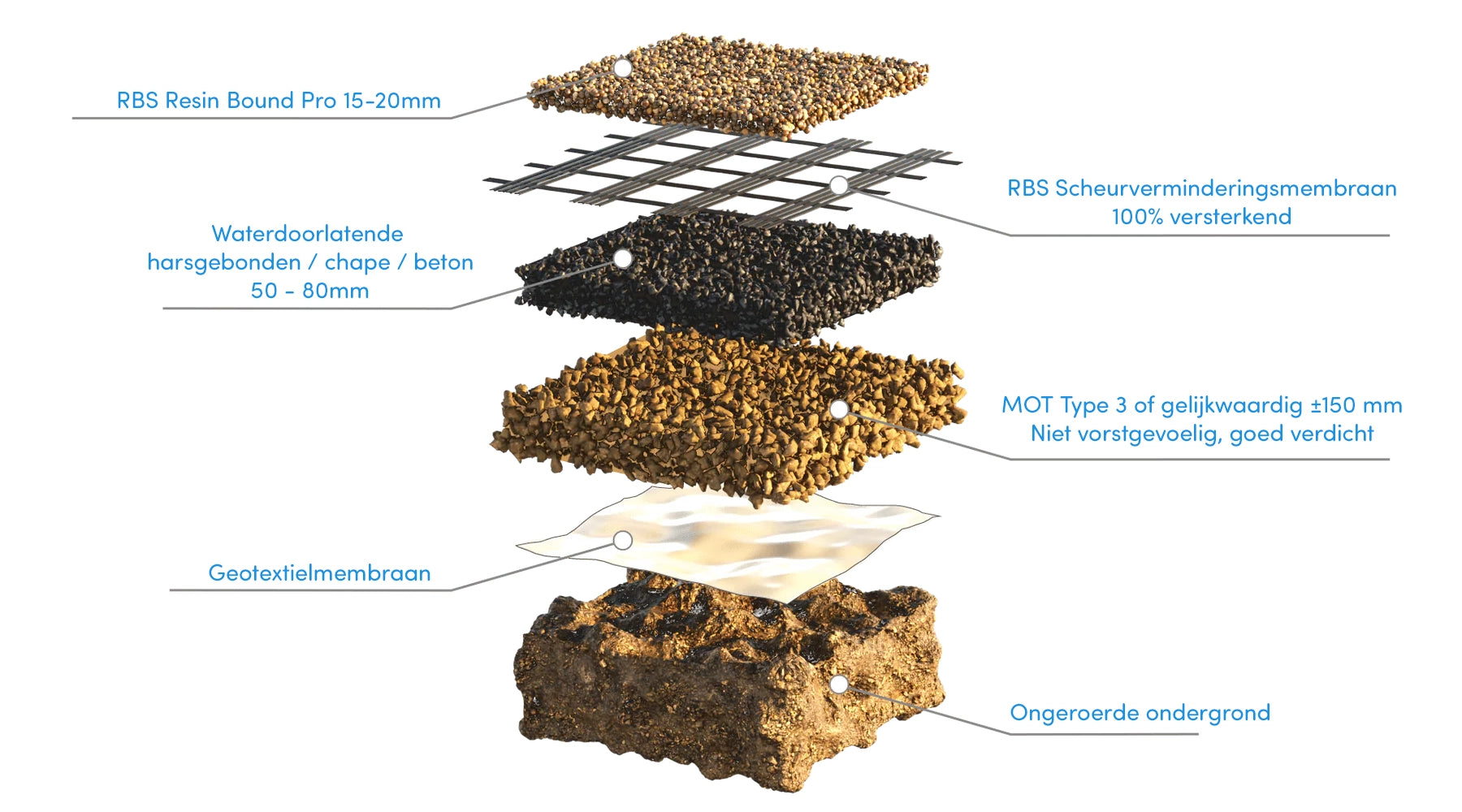 👉 Een kwalitatieve harsgebonden toplaag begint letterlijk bij de basis. De fundering en opbouw onder je harsgebonden oppervlak zijn cruciaal voor een duurzame afwerking, goede waterafvoer en een vlak, scheurvrij resultaat. Besparen op deze stap kan later tot dure problemen leiden. Bekijk het schema hieronder voor een duidelijk overzicht van de lagen die een professionele plaatsing vereisen.