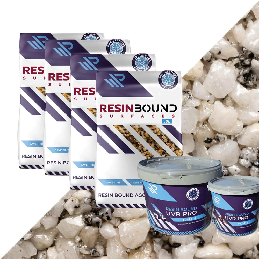 Aspen is een uitstekende keuze voor wie licht en luchtige elementen aan zijn eigendom wil toevoegen. Deze kleur, met lichtgekleurde stenen en een dichte structuur, is de perfecte aanvulling voor elk huis en creëert een eigentijdse esthetiek die tijdloos blijft. Onze Resin Bound UVR Pro moet met deze kleur worden gebruikt. Deze bundel bevat 4 zakken harsaggregaat van 25 kg en 7 kg UVR Pro-hars deel A en deel B.