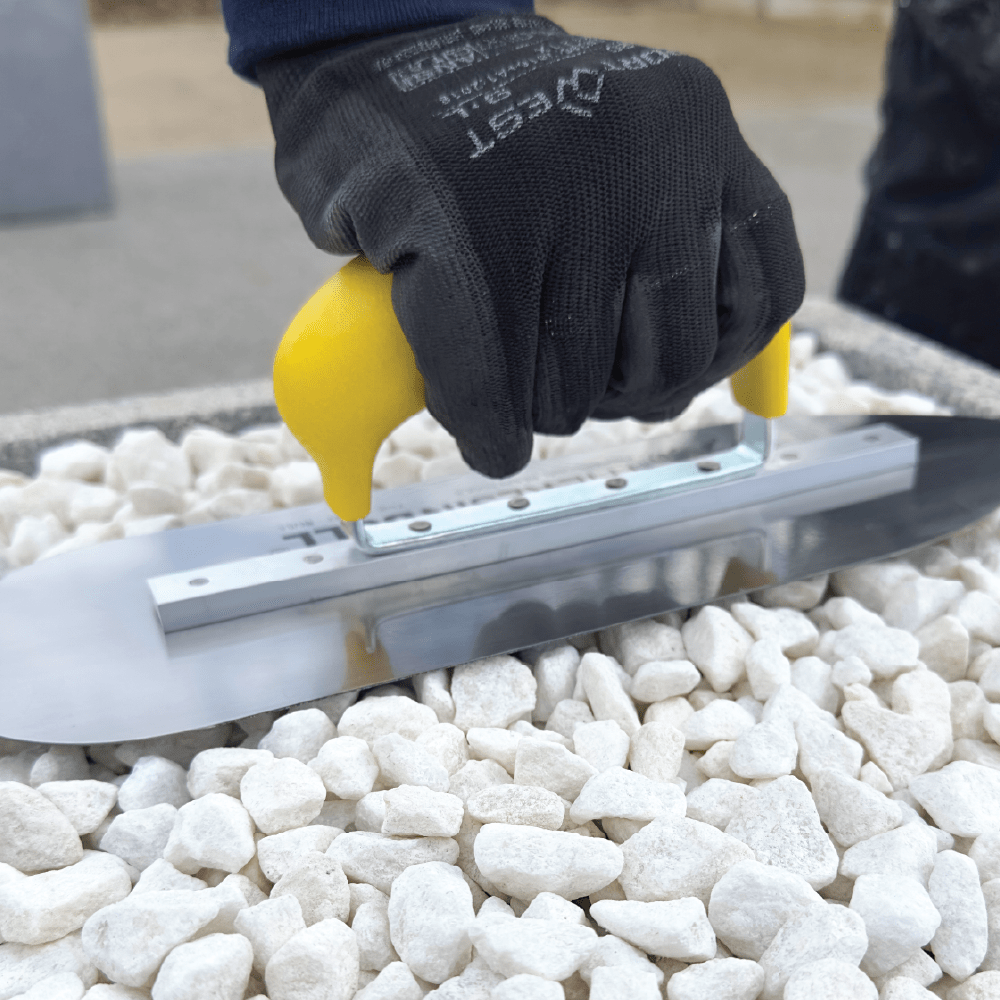 For a polished and uniform look, lightly press the surface using a hand trowel or a similar flat tool. This step helps set the stones in place and creates a firmer, more compact finish. Avoid pressing too hard, just enough to help the binder settle and secure the stones.